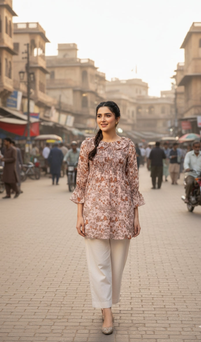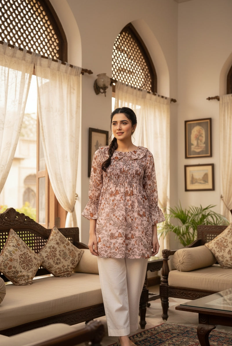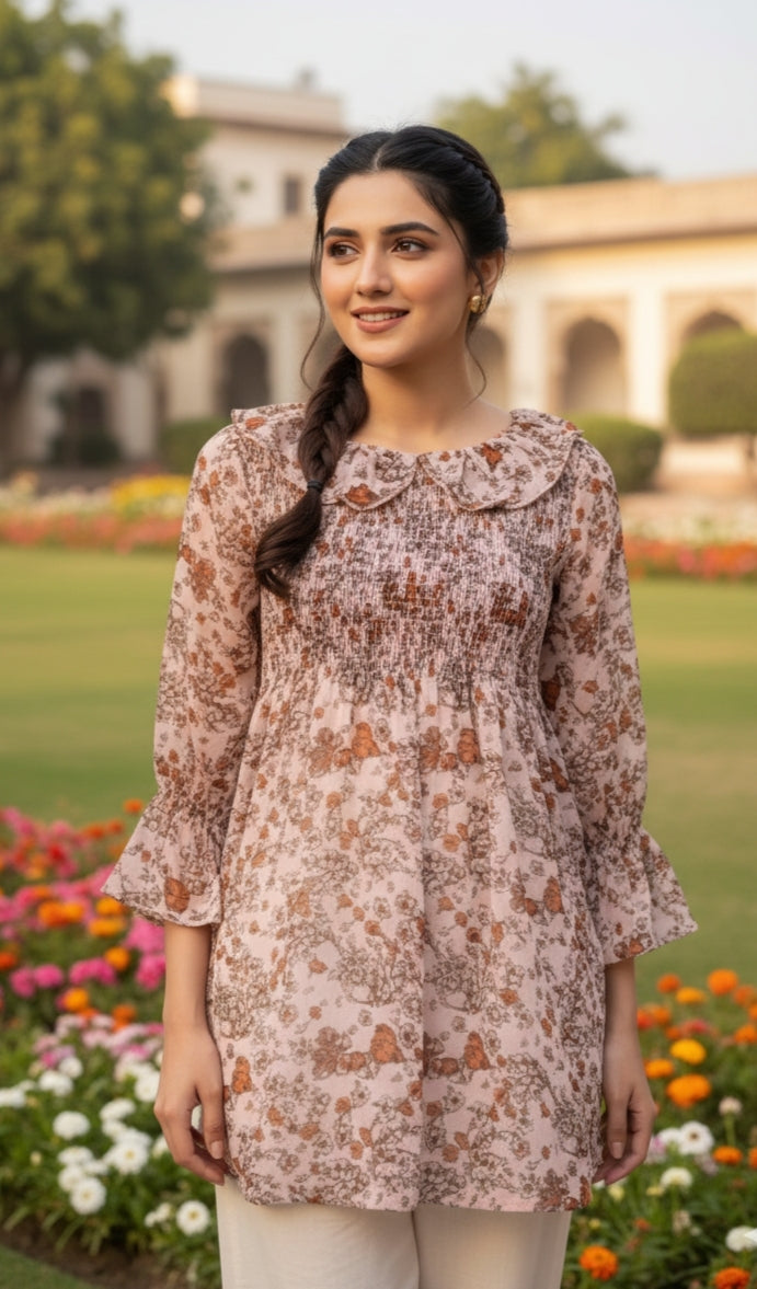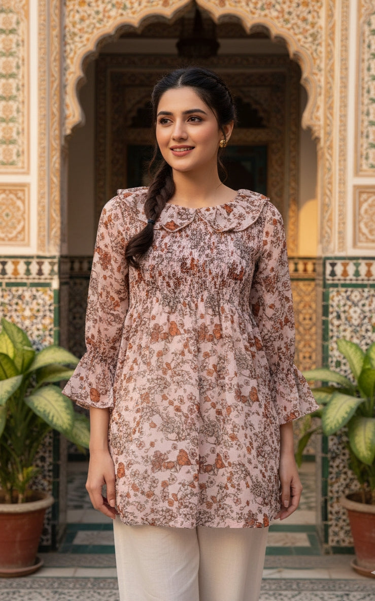 Add a touch of elegance to your wardrobe with this lightweight georgette top featuring a beautiful floral print and flared sleeves. Perfect for brunch dates, meet-ups, or casual evenings, it drapes beautifully and keeps you comfortable all day.